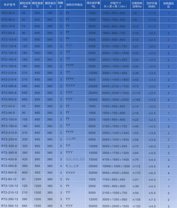 臺車式電阻爐爐側密封部分中溫臺車式電阻爐高溫臺車式電阻爐大型臺車爐爐門加熱元件大型臺車式高溫電阻加熱爐自動翻轉臺車爐爐門臺車一體式臺車翻轉爐高溫臺車式電阻爐(雙臺車+中轉臺車)滾珠帶式臺車爐臺車式模具回火爐臺車式調質爐 全纖維節(jié)能爐膛 用途本系列臺車式電阻爐適用于大中型金屬材料或制品進行正火、調質淬火、高溫淬火、退火、高溫回火等熱處理使用?;窘M成主要有爐殼、爐襯、爐門及爐門升降機構、加熱元件、臺車及臺車傳動機構、密封機構、智能電氣控制系統(tǒng)等組成。全纖維節(jié)能爐膛設備結構特點特性Rt系臺車式電阻爐是國家標準節(jié)能型周期式作業(yè)爐,超節(jié)能結構,采用復合纖維保溫,比普通磚爐結構節(jié)能30%左右,自動密封臺車和爐門。中小型臺車爐不需基礎安裝,一體化連軌,放在水平地面即可是使用。主要用于高鉻、高錳鋼鑄件、球墨鑄件、軋輥、鋼球等零件的淬火、退火、時效以及各種機械零件熱加工之用。大型電爐采用多區(qū)加熱,為提高爐溫均勻性在爐門、后墻、臺車上布置加熱元件大功率電爐配套多臺自動控溫柜,分別對多區(qū)加熱進行自動控溫。對爐門和臺車的運行全自動控制,每臺電柜上裝有若干塊儀表以及中園圖自動記錄儀/無紙記錄儀,對爐溫進行控制、自動記錄、超溫自動斷電保護等。大型臺車式電阻爐型號及規(guī)格參數表中小型臺車式電阻爐型號及規(guī)格參數表